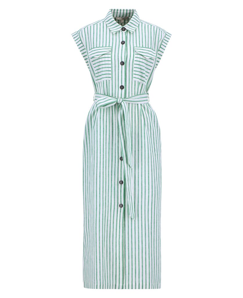 Ebben a kollekcióban az Abby ruha könnyed, nyári pamut–lenvászon keverékből készült, fehér–zöld függőleges csíkozással. A zsebeken és a galléron a minta vízszintesre vált, ezzel is játékos részletet csempészve az összképbe.