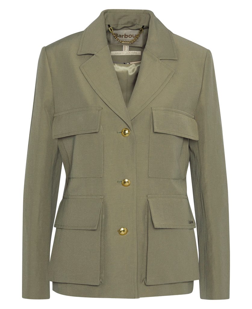 Rendkívüli női zakó négy funkcionális (!) zsebbel, amelyet erősen inspiráltak a katonai egyenruhák. A cargo dizájnt három kerek arany gomb és egy lenyűgöző fényes, viszkóz keverékű bélés, valamint klasszikus hajtóka teszi teljessé.