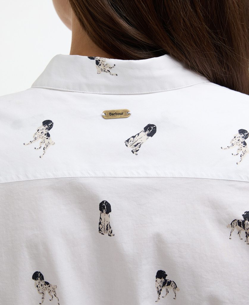 Egyenruha kutyasétáltatáshoz? Most találták fel. Könnyű, hosszú ujjú női ing pamutból, elasztán hozzáadásával, világos fehér alapon, játékos kutyamintával. Ideális választás olyan időben is, amikor legszívesebben ki sem mozdulna – de a séta nem maradhat el.