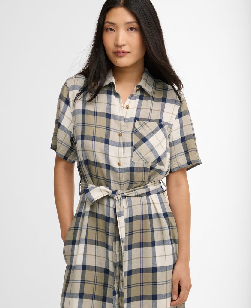 Ing fazonú ruha könnyű lyocell–len keverékből, amely jól szellőzik és kellemesen sima tapintású. A szabás lazább, de a derékrészen található megkötős övvel egyszerűen alakítható a sziluett. Midi hosszúságú, azaz vádlira ér, rövid ujjú, és teljes hosszában gombos záródású, egészen az inggallérig. A mellrészen rávarrt zseb, hátul a nyaknál apró fém Barbour embléma található. Olyan ruha, amely szandállal egy nyaraláson és sportcipővel a városban is megállja a helyét.