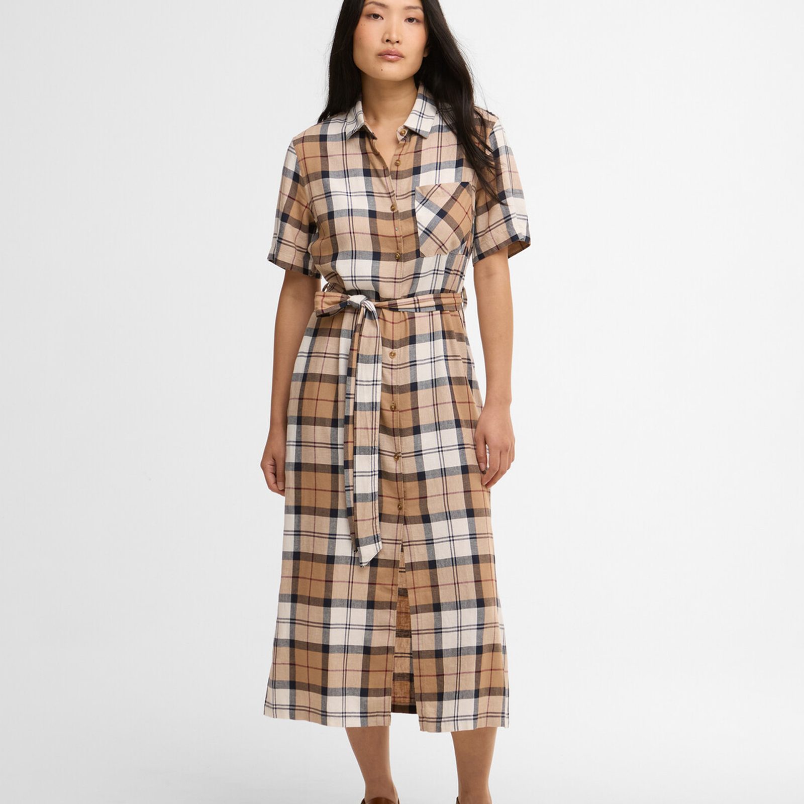 Ing fazonú ruha könnyű lyocell–len keverékből, amely jól szellőzik és kellemesen sima tapintású. A szabás lazább, de a derékrészen található megkötős övvel egyszerűen alakítható a sziluett. Midi hosszúságú, azaz vádlira ér, rövid ujjú, és teljes hosszában gombos záródású, egészen az inggallérig. A mellrészen rávarrt zseb, hátul a nyaknál apró fém Barbour embléma található. Olyan ruha, amely szandállal egy nyaraláson és sportcipővel a városban is megállja a helyét.