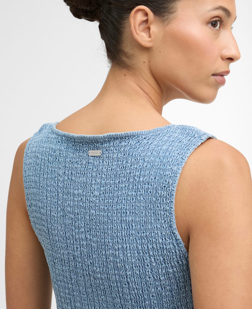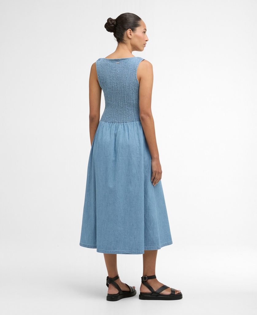 Női ruha chambray anyagból, amely egy olyan könnyű pamutszövet, amely első pillantásra a farmerre emlékeztet (hasonlóan „márványozott” felületű), de viselése lényegesen vékonyabb és légiesebb érzetet kelt. A ruha felső részét egy ráncolt, széles pántos, mélyebb kerek kivágású felsőrész alkotja, amely követi a test vonalát és elegánsan formálja a sziluettet. Deréktól lefelé a szoknyarész lágyan, A-vonalban szélesedik ki. A praktikum terén sem ismer tréfát: a ruhán két funkcionális oldalzsebet is talál.