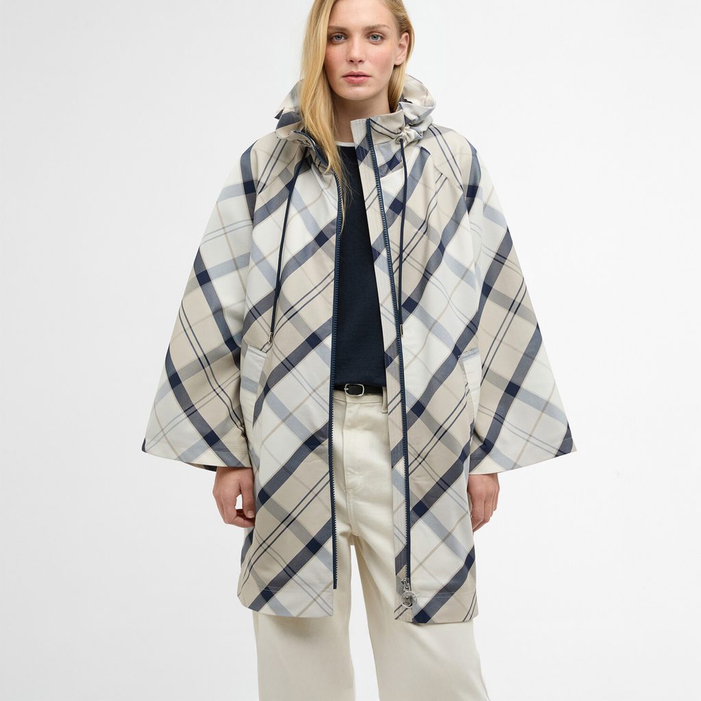 A Kinsale női pelerina Dress Navy tartán mintával puha, szőtt poliészter anyagból készült, vízálló kezeléssel. A kapucni a ruhadarab szerves része, az ujjak jellegzetesen szélesek, oldalt látható cipzárral, az oldalsó hasítékokat pedig patentkapcsok rögzítik.