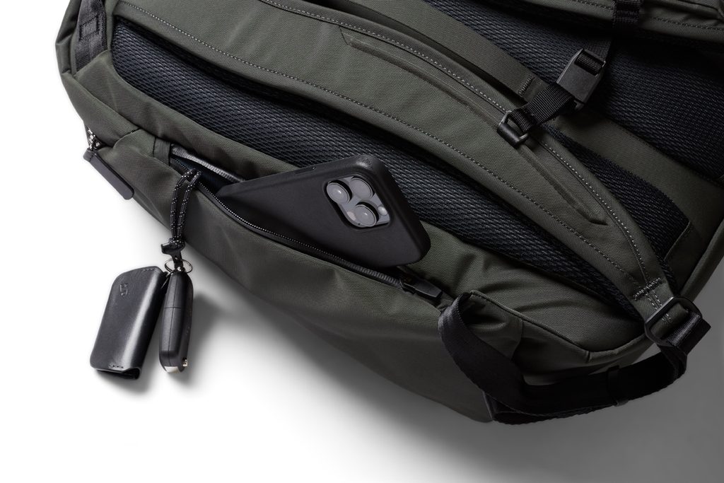 Okosan kialakított belső rendszere rengeteg zsebet kínál, de a külső rész is jól átgondolt: oldalsó, rejtett zsebek a legfontosabbakhoz, és egy párnázott felső tok a szemüvegnek – minden kéznél van, amit a nap során elérhető közelségben szeretne tudni.