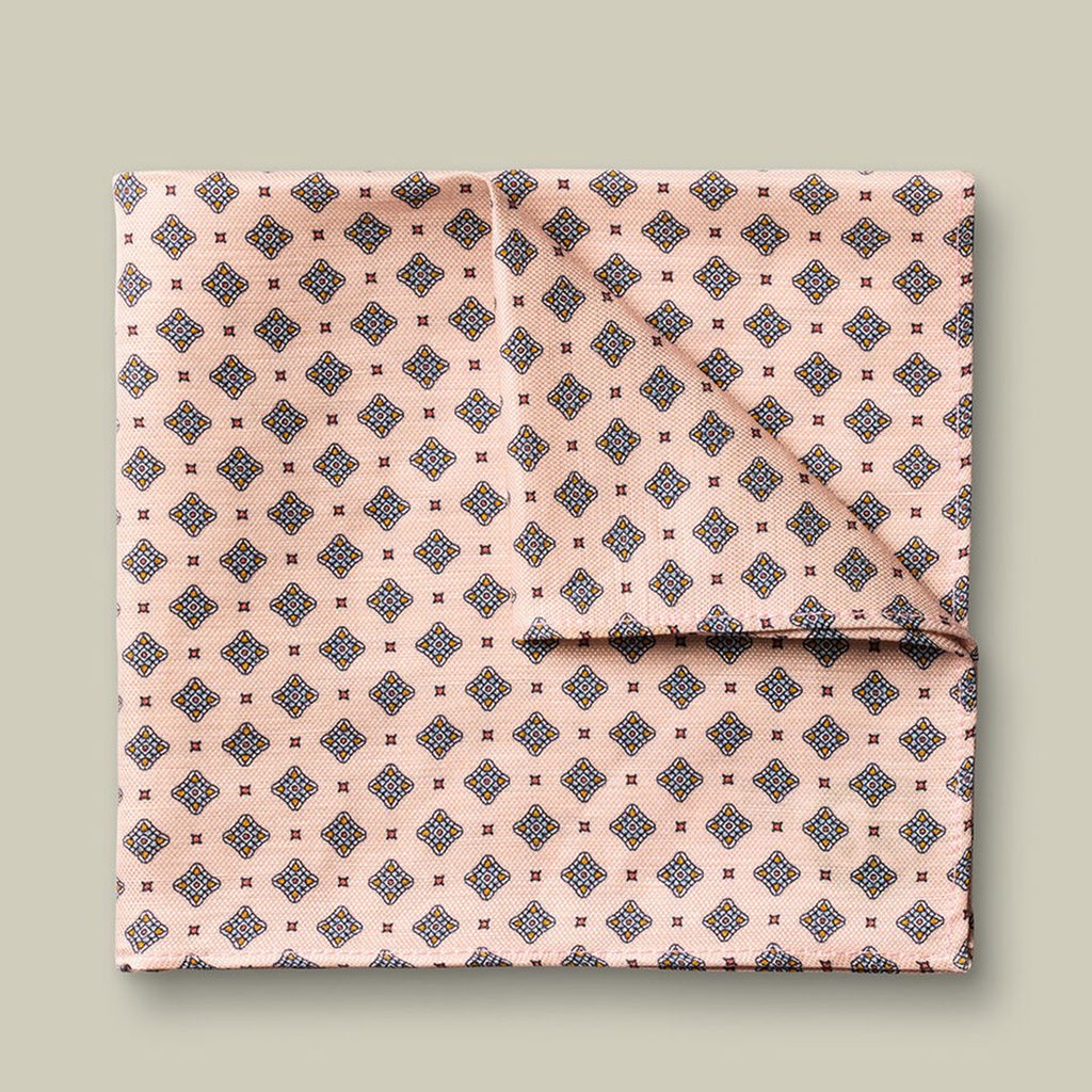 Már az első érintésre prémium minőségű, len és selyem keverékéből készült díszzsebkendő, amely nemcsak nyári zakókhoz ideális, de ráadásul még gyönyörű geometrikus mintával is díszített.