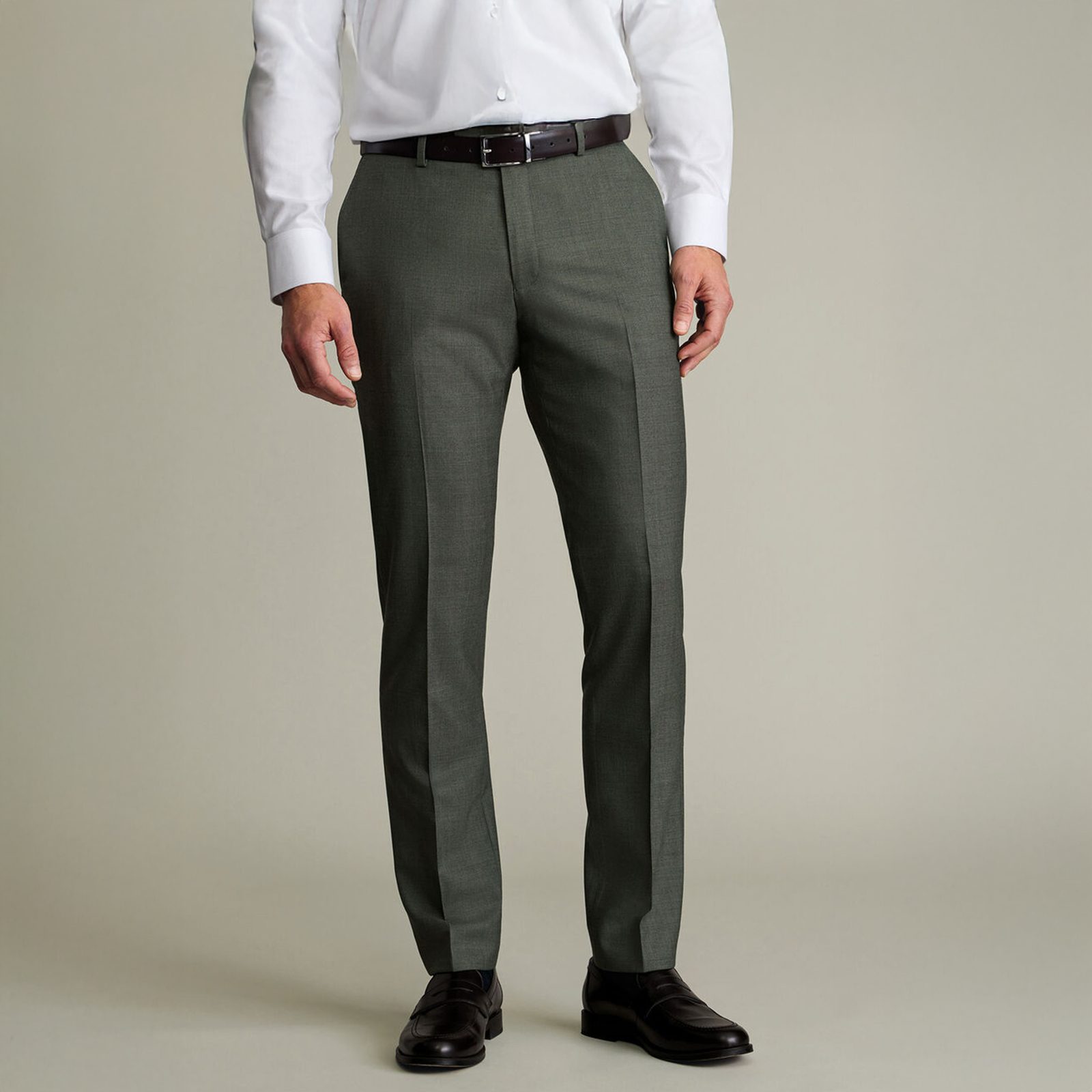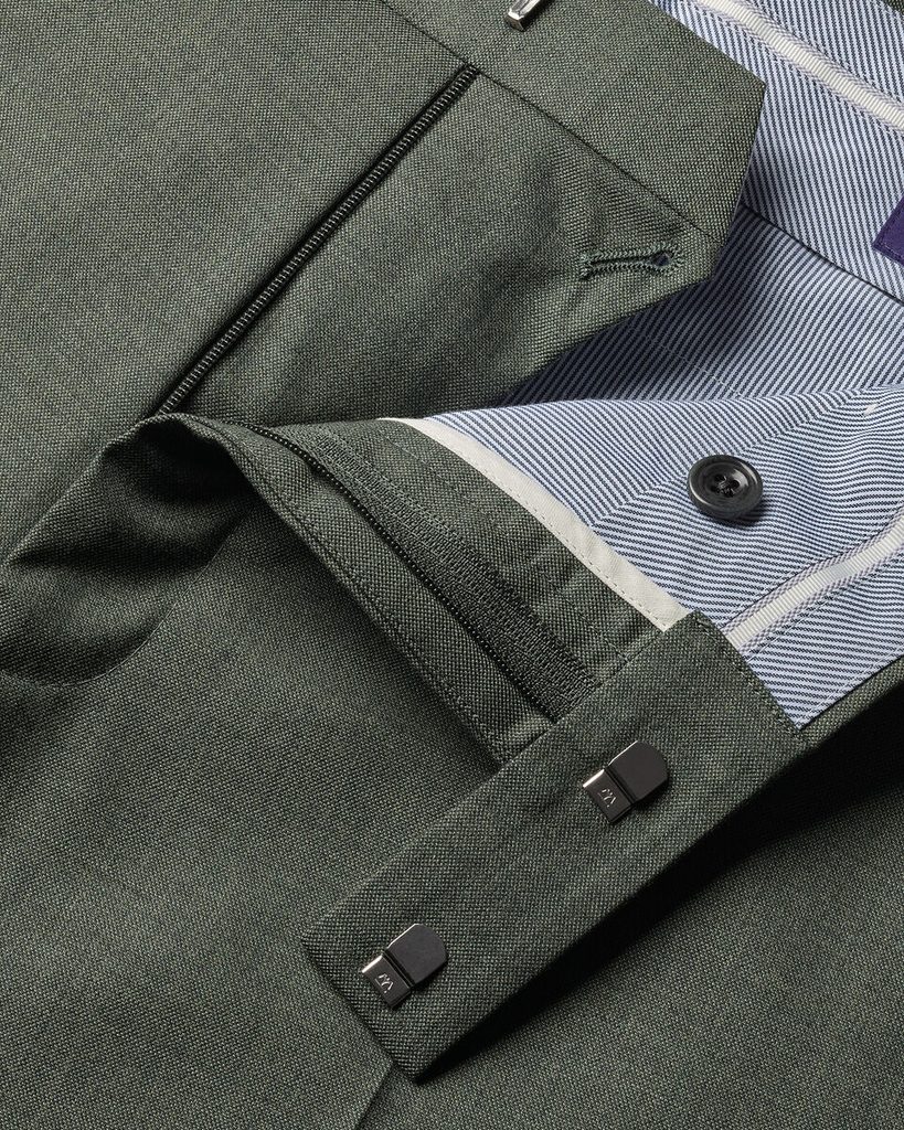 A nadrág természetes rugalmassággal rendelkezik, és jól visszanyeri alakját gyűrődés után is, így hosszabb viselés során is megőrzi formáját. A szabás enyhén karcsúsított, az eleje sima, hajtások nélkül, ugyanakkor éllel vasalt. A bélés térdig ér. A részletek is a magasabb kategóriát jelzik: ferdén szabott, AMF-varrással díszített zsebek, szélesebb, legfeljebb 4,5 cm-es öv befogadására alkalmas derékrész, valamint belül gumírozott csík, amely a helyén tartja az inget.