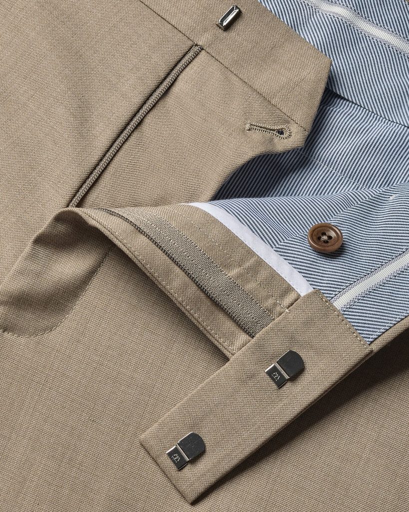 A nadrág természetes rugalmassággal rendelkezik, és jól visszanyeri alakját gyűrődés után is, így hosszabb viselés során is megőrzi formáját. A szabás enyhén karcsúsított, az eleje sima, hajtások nélkül, ugyanakkor éllel vasalt. A bélés térdig ér. A részletek is a magasabb kategóriát jelzik: ferdén szabott, AMF-varrással díszített zsebek, szélesebb, legfeljebb 4,5 cm-es öv befogadására alkalmas derékrész, valamint belül gumírozott csík, amely a helyén tartja az inget.