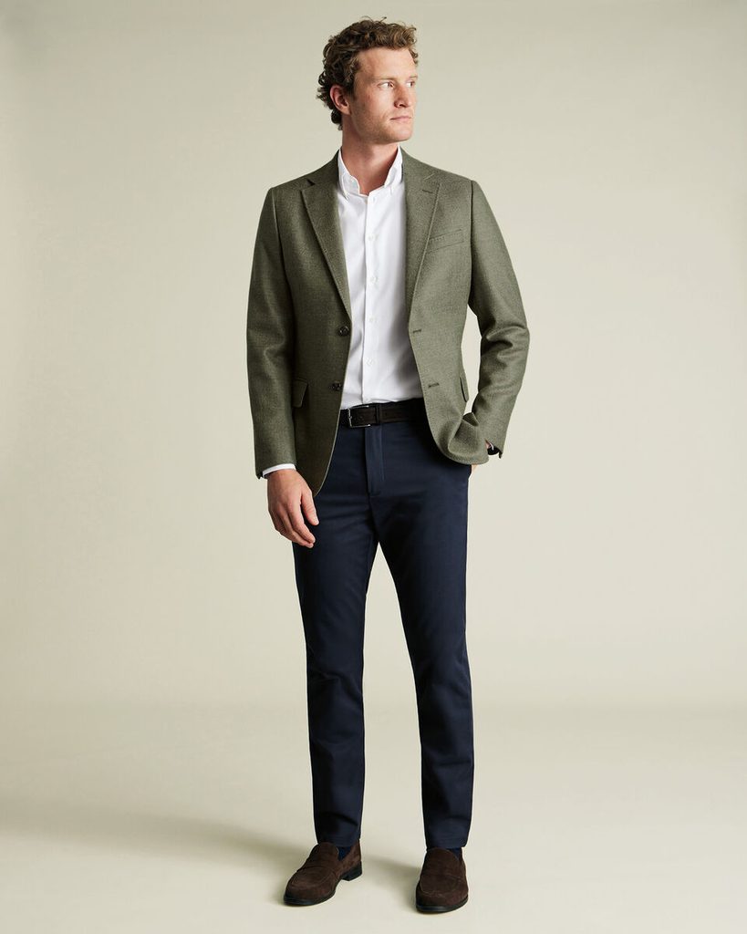 Emellett hozza a Charles Tyrwhitt márkánál megszokott részleteket is: fenntartható anyagból készült márványhatású gombok (sem orrszarvúk nem estek áldozatul, sem mikroműanyagokat nem fog belélegezni), egy soros gombolás, díszmandzsetták; kevésbé párnázott vállrész a természetesebb megjelenésért, valamint két hátsó bevágás.
