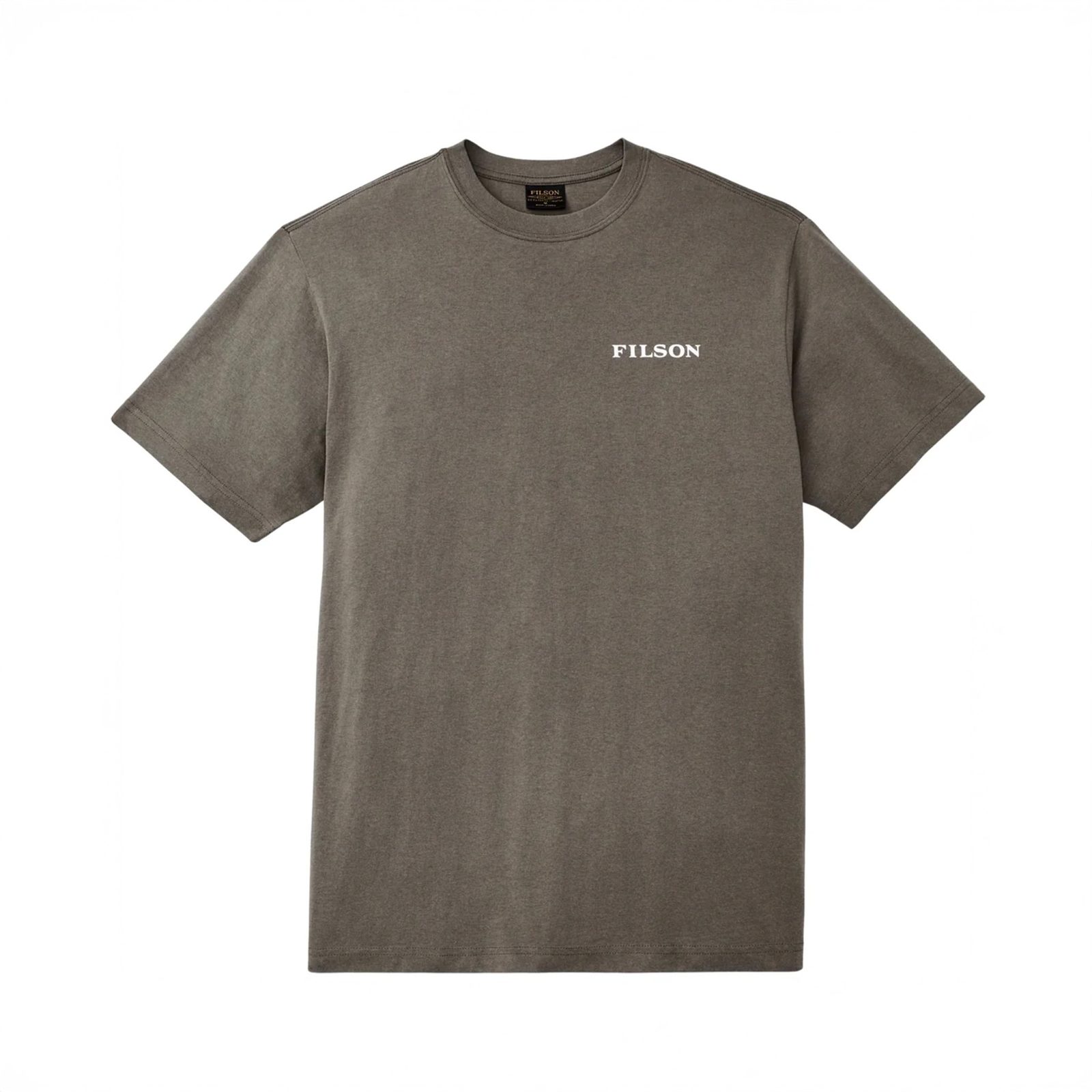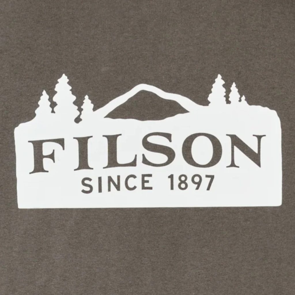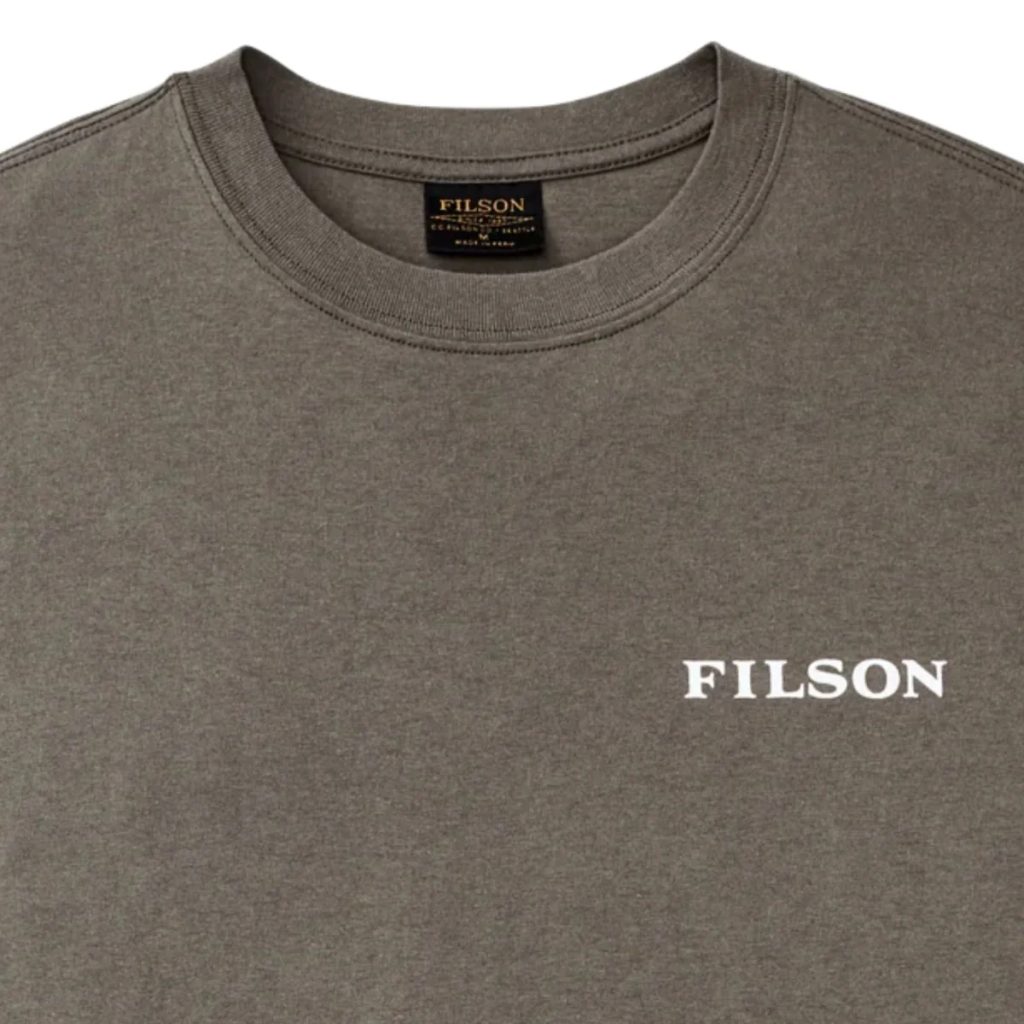 A Filson férfi pólója perui pamutból, 5,2 oz súlyban – valamivel vastagabb, mint amihez egy pólónál szokva lehet, de ez a darab mégis kényelmes viselet. Emellett bordázott szegélyű kerek nyakkivágással rendelkezik, amely ismételt mosás után is megtartja formáját. A mellrészen a Filson logója, a hátán erdei tájképet ábrázoló grafika látható. Nem tévesztendő össze a másik erdős márkánkkal.