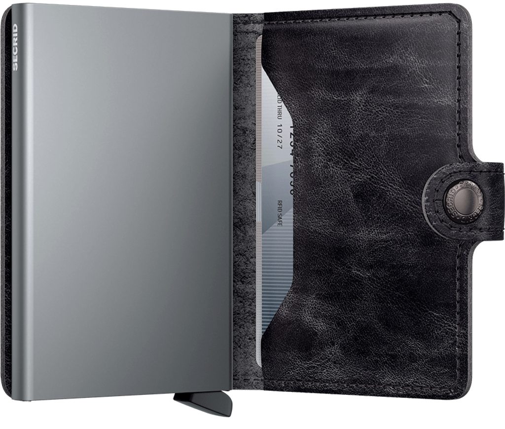 Ennél a karcsú pénztárcánál a kártyák számára biztosított hely kapja a főszerepet – hiszen ma már szinte elképzelhetetlen az élet nélkülük. A Secrid pénztárca központi eleme ezért egy könnyű és vékony alumíniumtok, amely 4–6 kártyát képes tárolni attól függően, hogy dombornyomottak-e vagy sem. A kártyákhoz való hozzáférés egyszerű – egy műanyag kihúzható kar segítségével történik. A szabadalmaztatott kialakításnak és a felhasznált anyagnak köszönhetően a tok RFID-védelemmel is el van látva, amely megakadályozza a kártyák távoli lemásolását.